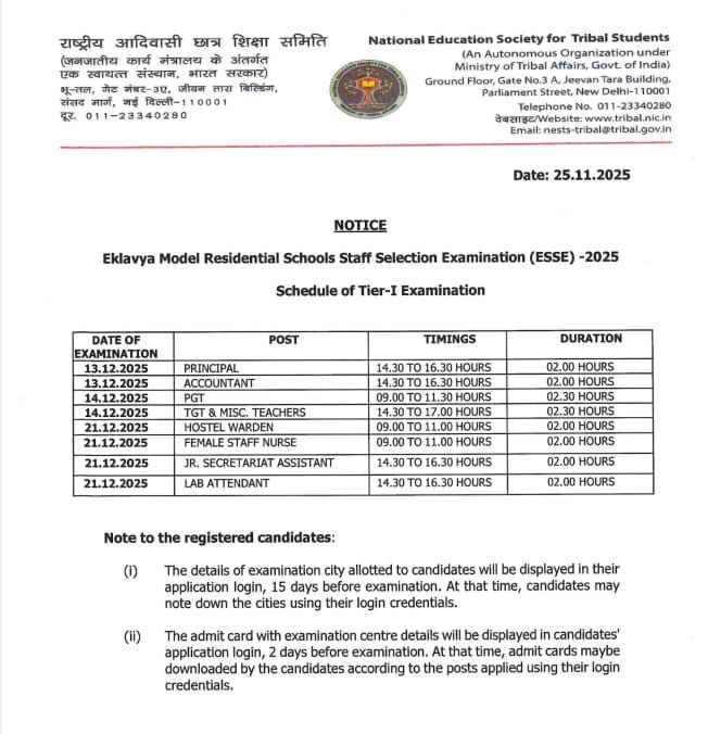 राष्ट्रीय आदिवासी छात्र शिक्षा समिति (NESTS) द्वारा Eklavya Model Residential Schools (EMRS) Staff Selection Examination – ESSE 2025 के लिए Tier-I परीक्षा कार्यक्रम जारी कर दिया गया है। इस भर्ती के तहत कुल 7267 पदों पर Principal, PGT, TGT सहित कई गैर-शैक्षणिक पदों पर नियुक्ति की जाएगी।