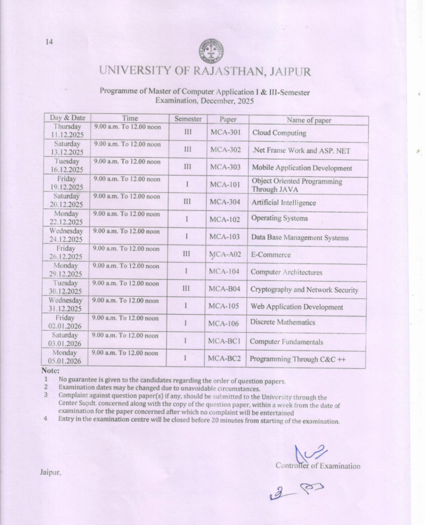 Rajasthan University (UNIRAJ) has officially released the MCA 1st Semester and 3rd Semester Exam Date Sheet for the upcoming examinations. All students enrolled in the MCA course under University of Rajasthan can now check their complete exam schedule and download the official timetable PDF directly from the link given below.
