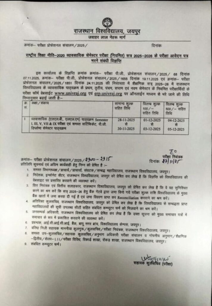 राजस्थान विश्वविद्यालय, जयपुर ने सत्र 2025–26 के Professional Courses (व्यावसायिक पाठ्यक्रमों) की परीक्षा आवेदन तिथि को बढ़ा दिया है। अब छात्र 05 दिसंबर 2025 तक सामान्य शुल्क, 100 रुपये विलम्ब शुल्क या 500 रुपये अतिरिक्त विलम्ब शुल्क के साथ अपना ऑनलाइन परीक्षा फॉर्म भर सकते हैं।